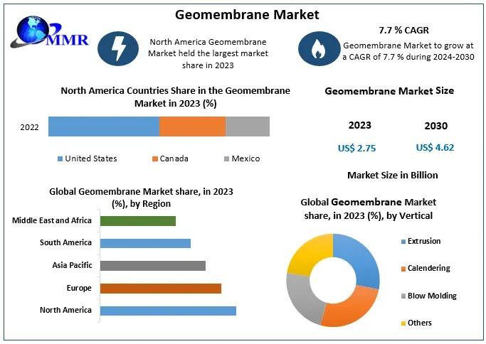The Geomembrane Market size was valued at USD 2.75 Bn in 2023 and is expected to reach USD 4.62 Bn by 2030, at a CAGR of 7.7%.
